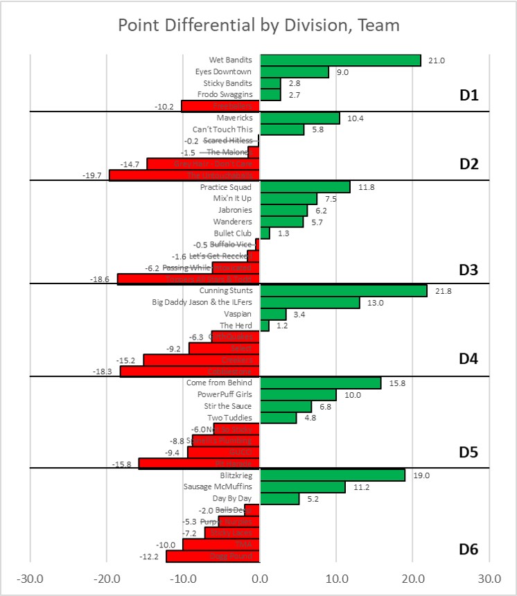 - The breakdown of best offenses, defenses and net point differentials per division. Last season for the first time ever, we had zero forfeits to adjust for, so a nice, clean data set. This session we had 14 forfeits! Yes, half of them came from Straw Hats, but there were still many others, which of course we backed out of the data set for our analytics. Then we tried to color each team's data by their official jersey colors, but half of this league apparently uses the same colors so it's not perfect (sorry Cunning Stunts for your sexist pink coloring!)