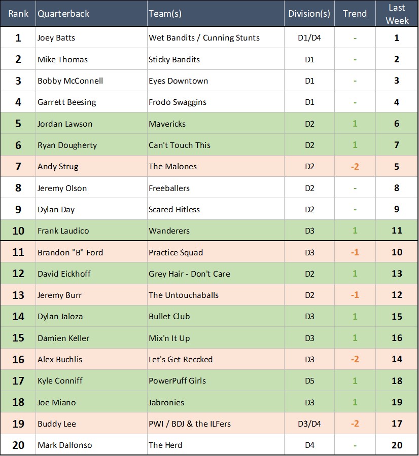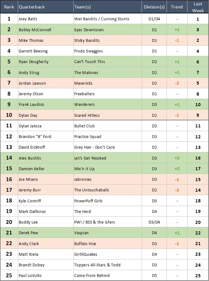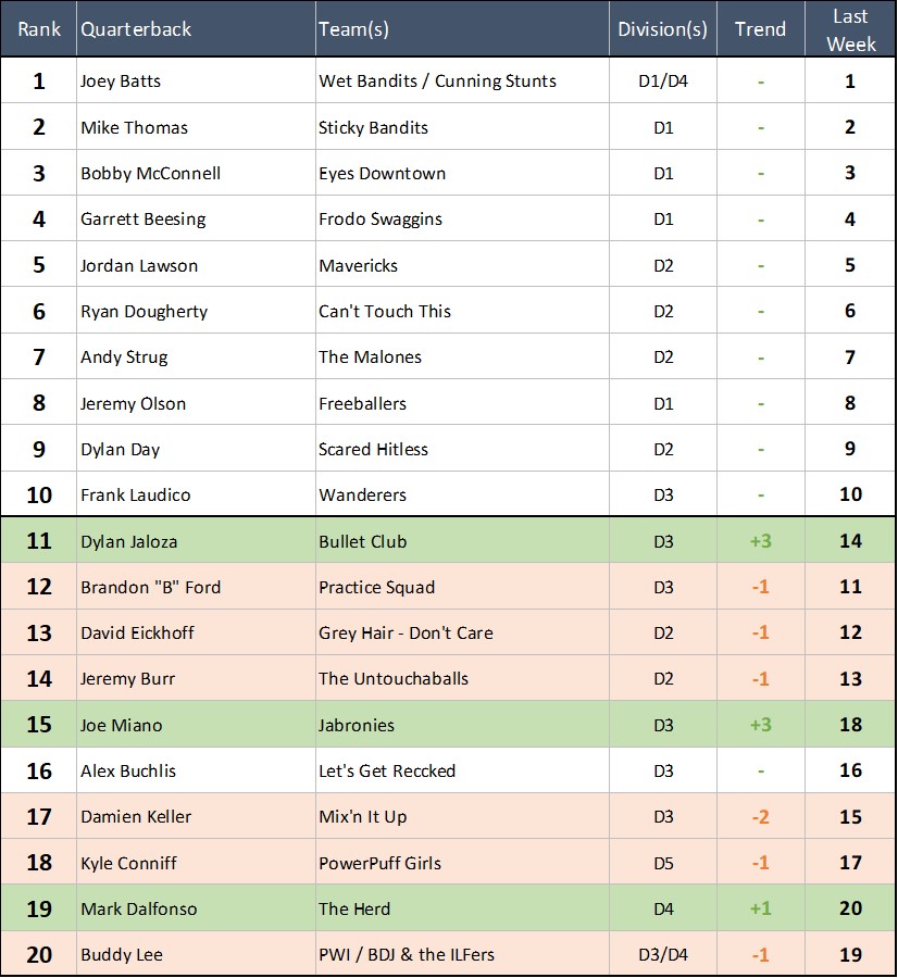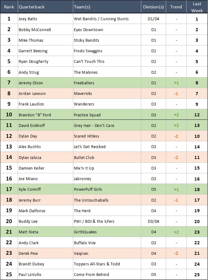That's it for the TSL Power Rankings this week! If you have any thoughts about QB rankings, or you want to make sure we know who's throwing for your team, please feel free to contact our good friend This email address is being protected from spambots. You need JavaScript enabled to view it.. You tell him, he'll tell us.