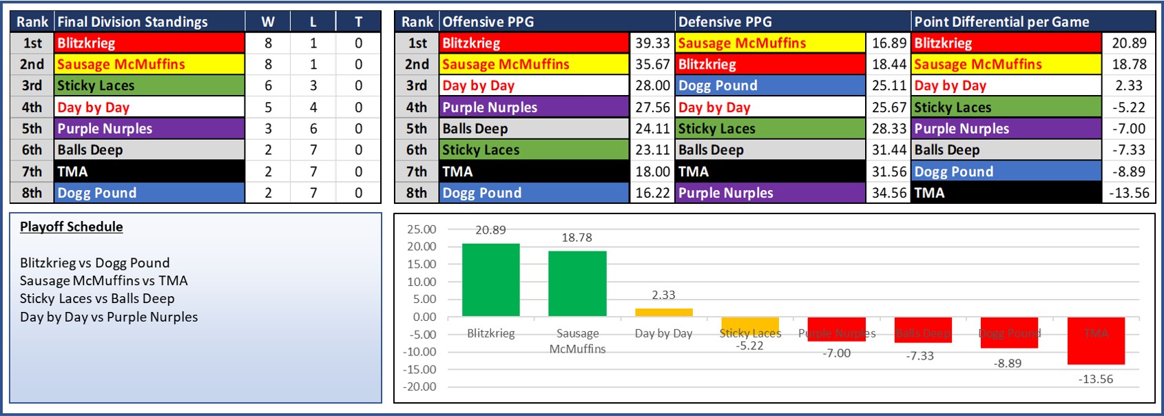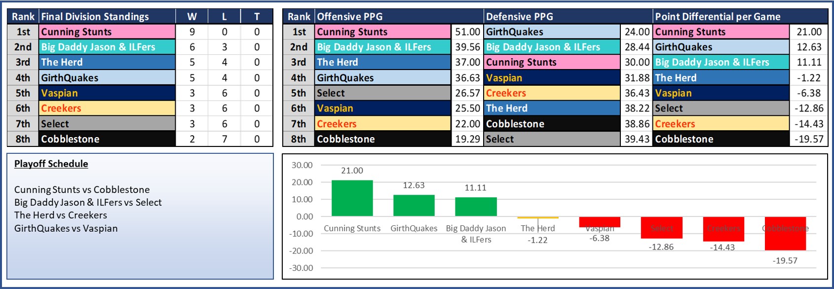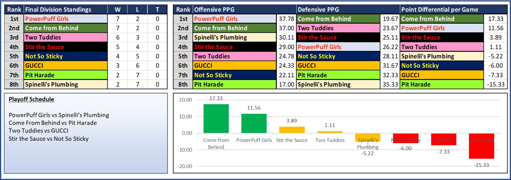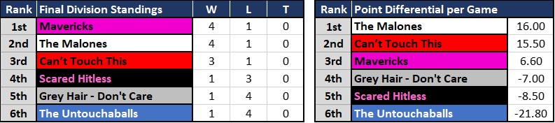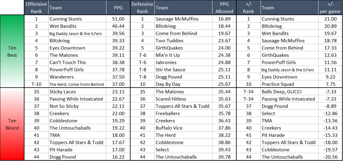 So if Cunning Stunts were the BEST offense, who were the worst? This season, just like last, we had six teams fail to make it to 20 PPG on offense. Those teams (Dogg Pound, TMA, Pit Harade, Toppers All-Stars & Todd, Untouchaballs and Cobblestone) unsurprisingly went a combined 10-44 this season.