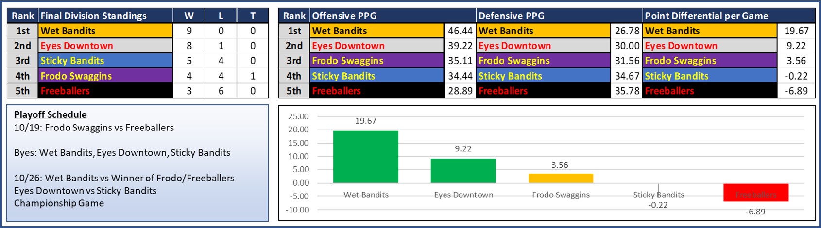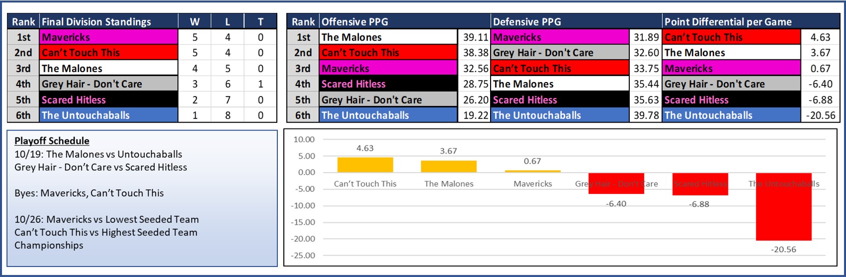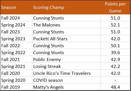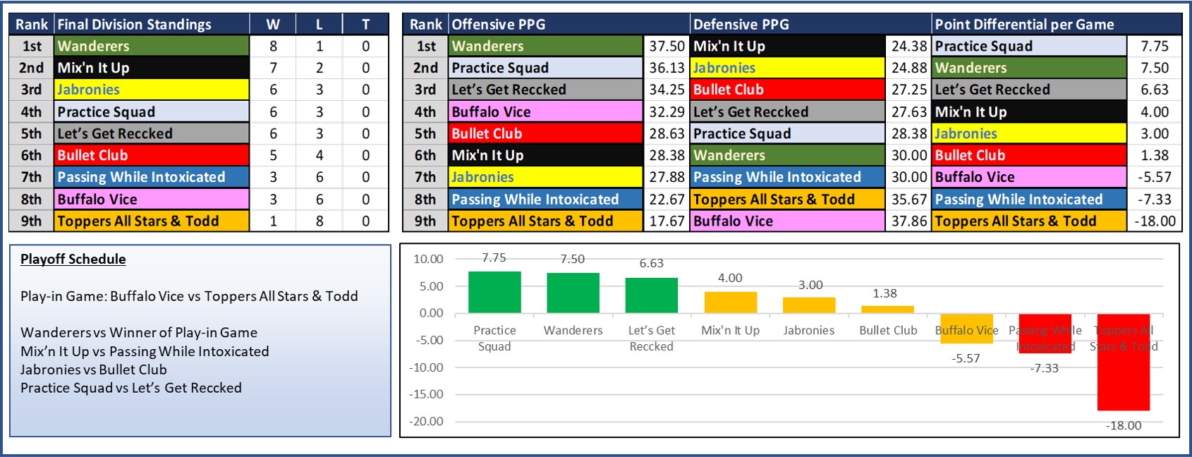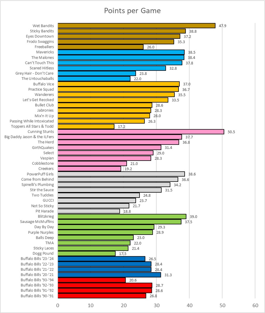 So if Cunning Stunts were the BEST offense, who were the worst? This season, just like last, we had six teams fail to make it to 20 PPG on offense. Those teams (Dogg Pound, TMA, Pit Harade, Toppers All-Stars & Todd, Untouchaballs and Cobblestone) unsurprisingly went a combined 10-44 this season.