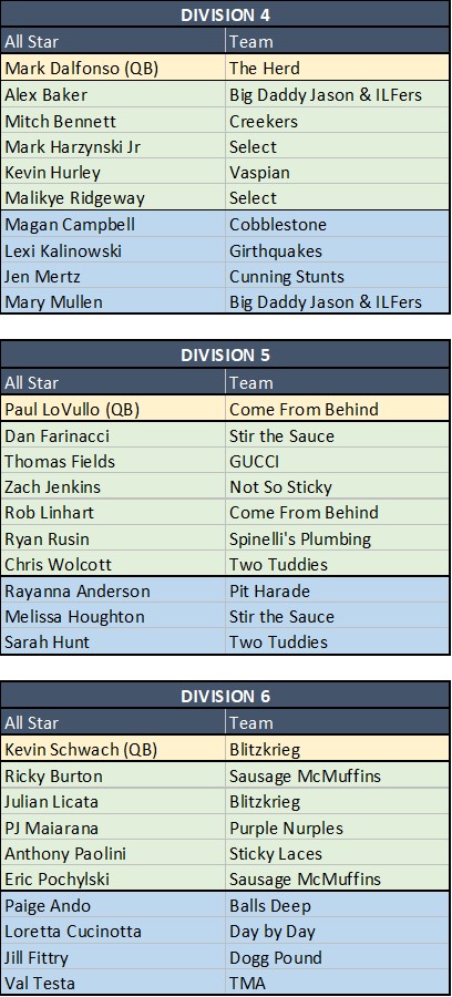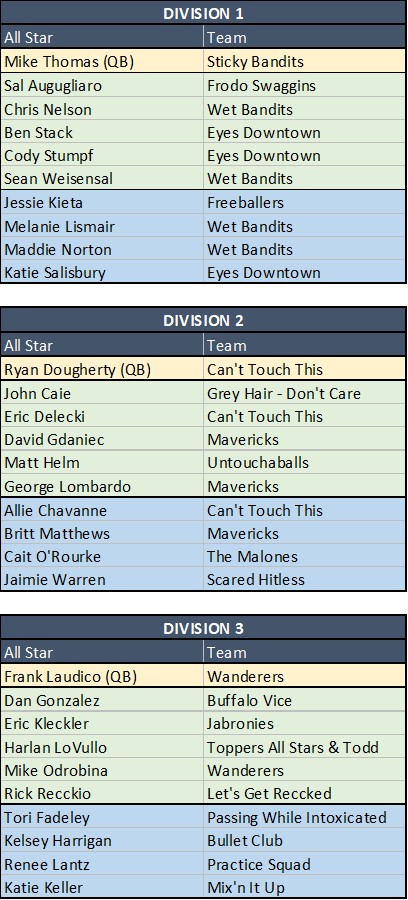 - We selected an All-Star team of 10 players from each division. Teams had to have one designated QB, at least five other male players, and at least three female players. The tenth spot could be either male or female depending on the strength of each particular division.