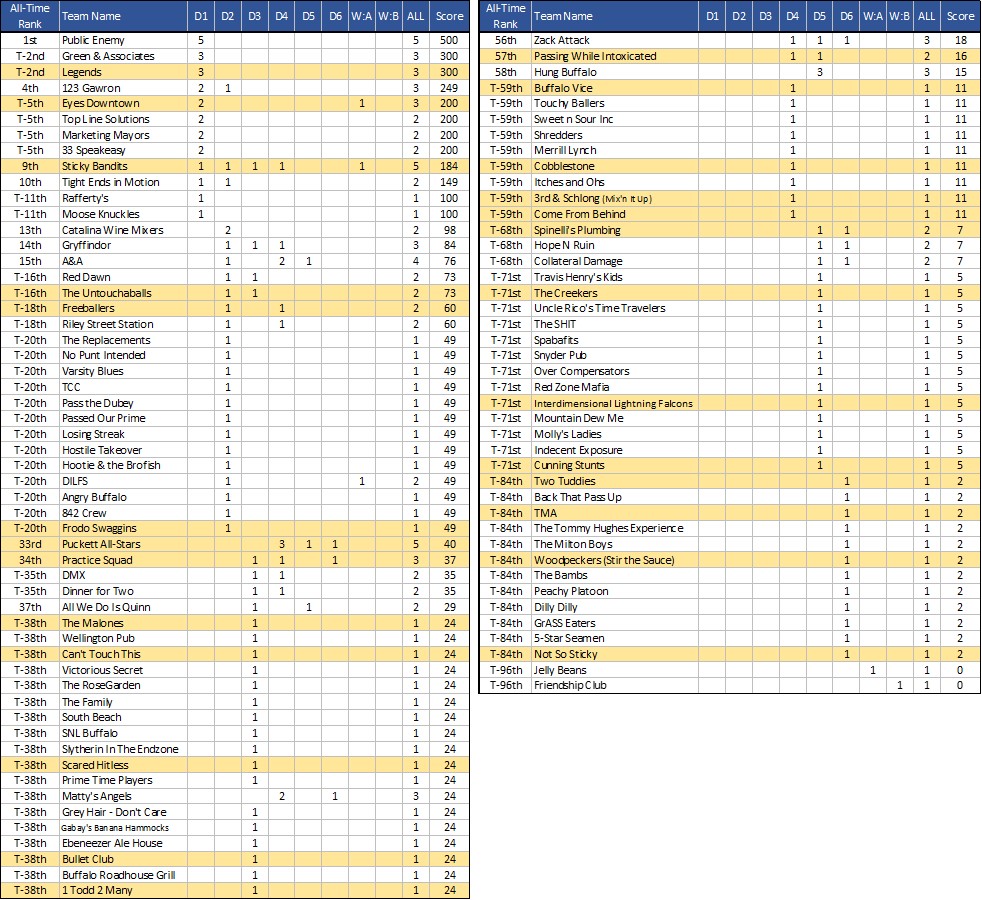 - Indoor championships aren't currently worth a point (though we may revise this in the future). With apologies to DILFS, Jelly Beans, Sticky Bandits, Eyes Downtown and Friendship Club, Winter sessions are often used to make new teams and play with new people. No team should be penalized in the rankings for doing that instead of entering their usual squad. We'll give them credit for "number of titles", which they've earned, but zero points awarded. Indoor championships are abbreviated as "W:A" (Winter: A) and "W:B" on the chart below, to make it a little easier to read.