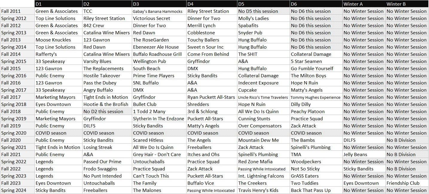 - Out of the three truly “all new teams” (Show Me Your TDs, Mo Chicken, Raw Milkers), Raw Milkers will finish with the best record this season