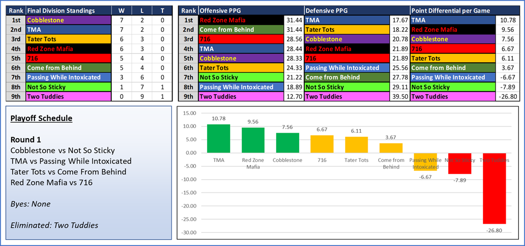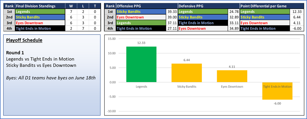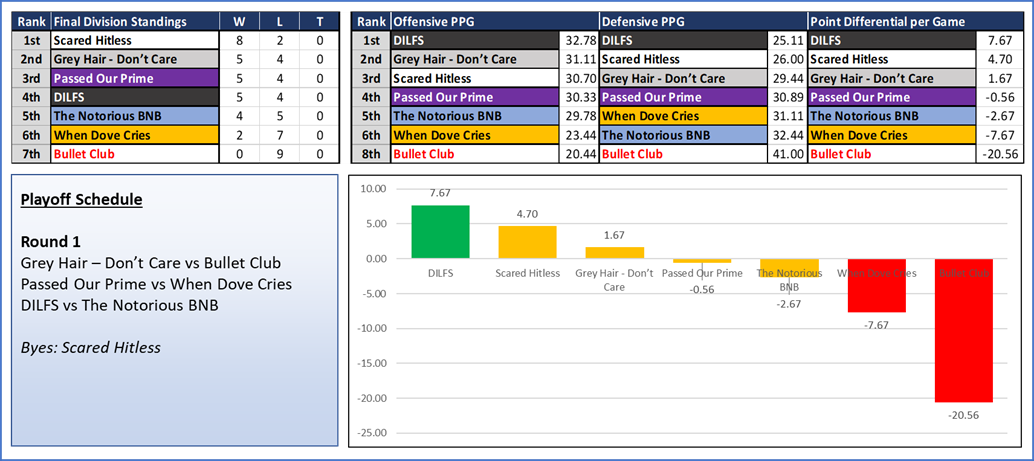 Scared Hitless has two more wins than the next best team in D2 and they can lock up the #1 seed (and first round playoff bye) with a win or tie next week against D1 Tight Ends in Motion. They'll probably be underdogs, and rightly fully so, but the gap between D1 and "the rest of D2" isn't as big as the gap between D1 and Scared Hitless. We're expecting a close one.