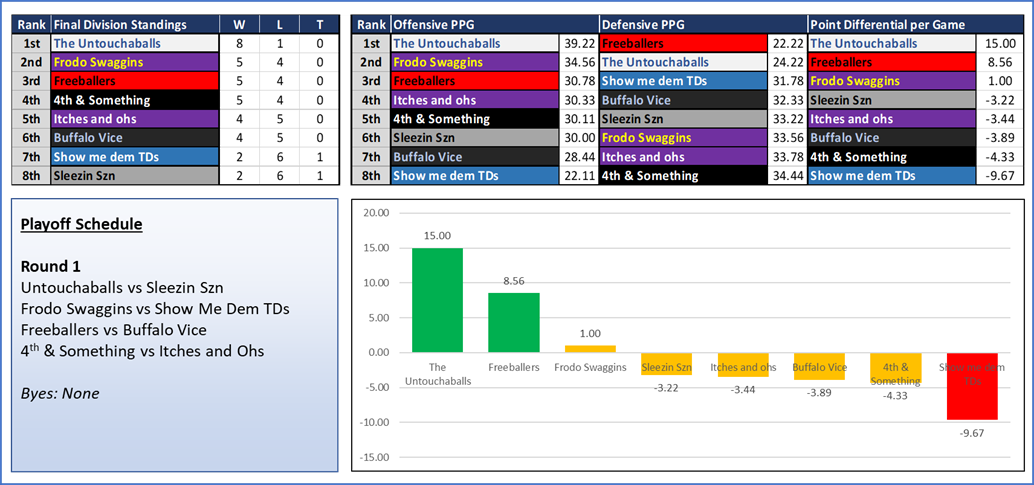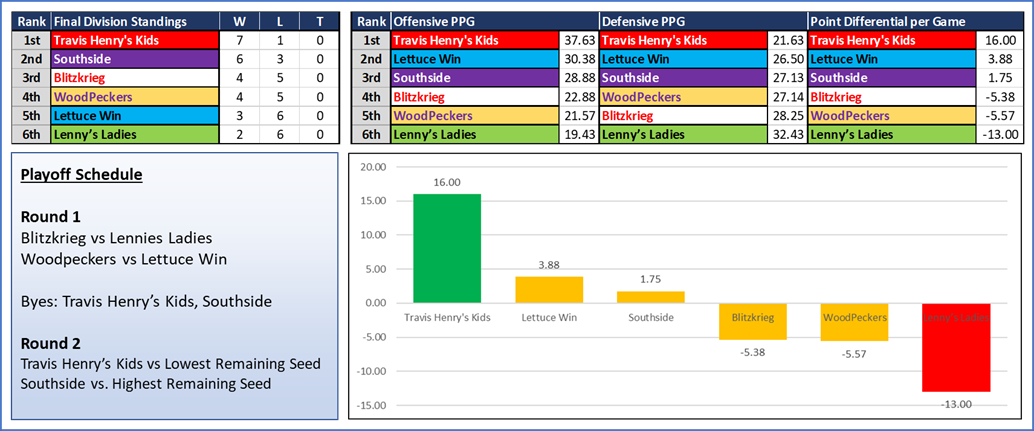 Travis Henry's Kids have the longest current winning streak in the League at six in a row. Over that span they've won every game by at least 19 points EXCEPT for their two games against Woodpeckers (which they won by 7 and 8). If anyone can stop John in the playoffs it's Joe Buscaglia and his 6'11" receivers.