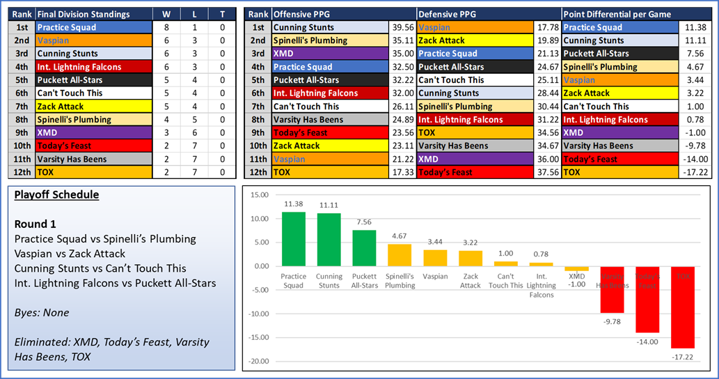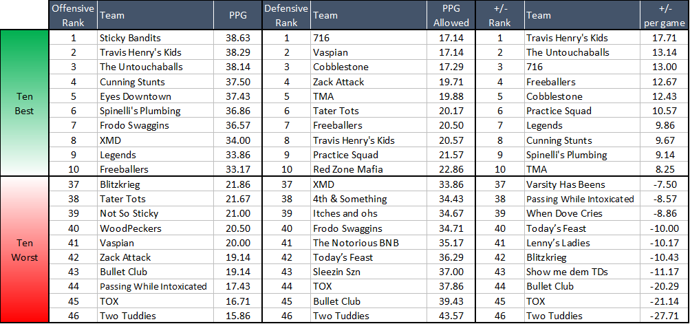 Conversely, we now have five teams averaging under 20.0 PPG allowed on defense (all of which play in D4 or D5). Last season we had zero, with only a handful under 20.0 PPG allowed the two seasons before that (remember when Mountain Dew Me allowed only 6.3 PPG a couple years ago??).