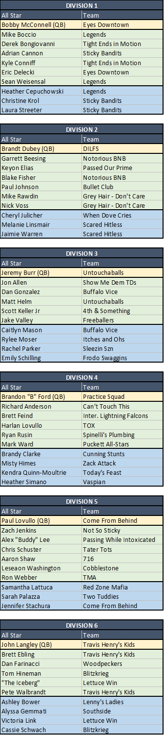 That's it for this week! As always, if you have any thoughts on why you hate this article (your team's QB should be ranked higher? you thought this would be your chance to shine in the D5 all-star team listing and we still snubbed you? the average age of our division all-star QBs is over 50 and you demand a youth movement?) please send an email to This email address is being protected from spambots. You need JavaScript enabled to view it.. Seriously, we can do this BETTER if you TELL us about your team!