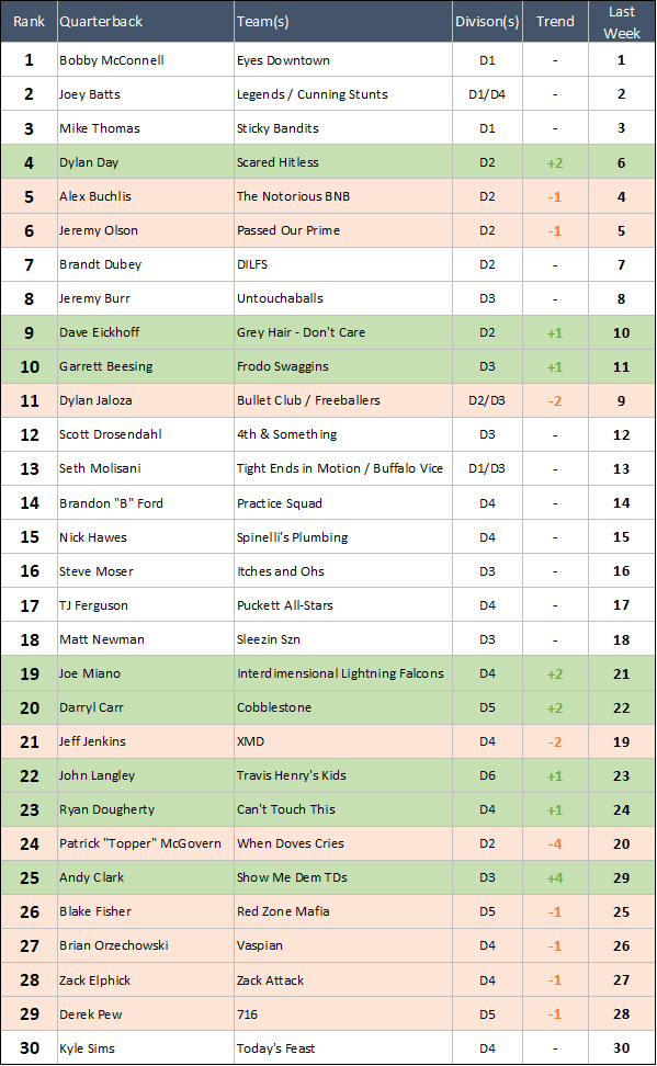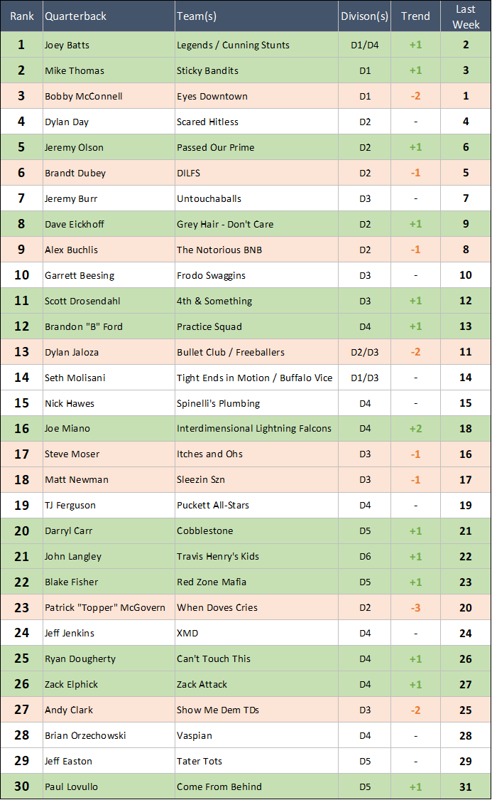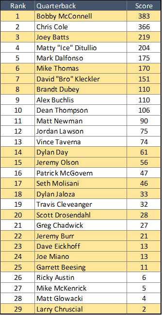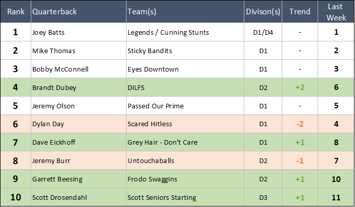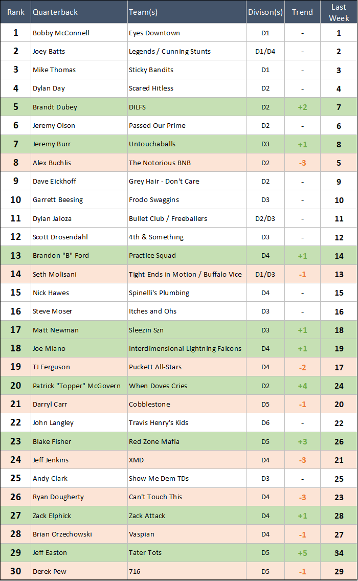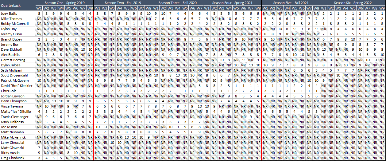 For all you TSL history buffs out there that want to know QB Power Rankings data stretching back before the Top Ten chart shown above, here is the entire history of the Top Ten going back the past six seasons that we've been Power Ranking (season three being shortened by one week due to COVID issues):