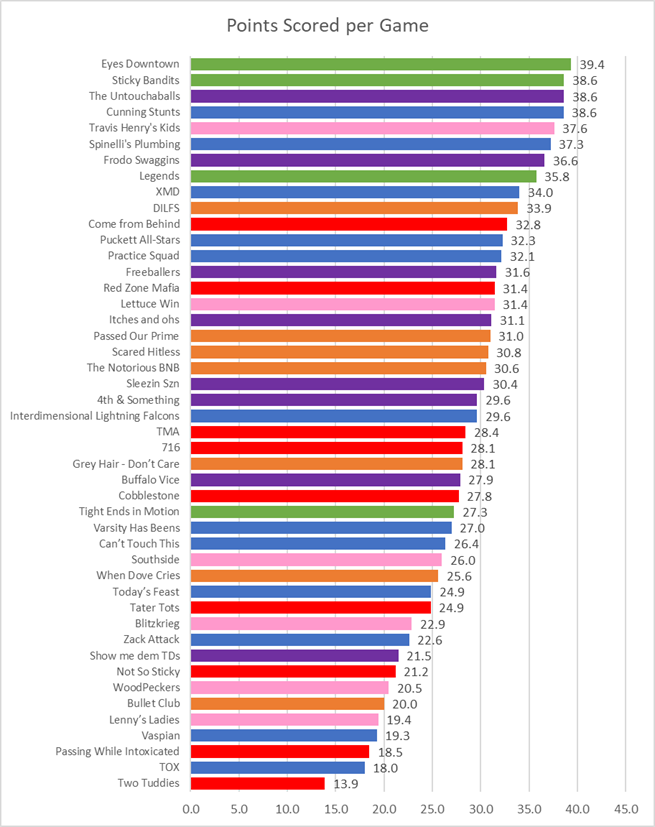 Scoring is way down from the last few sessions. The average team is scoring (and conversely, giving up) 28.5 PPG this season. Last Fall the average was 31.1 PPG, the Spring before that it was 30.2 PPG, and the Fall before THAT it was 29.9 PPG (aren't you glad we keep these records?). That may not seem like a big difference, but it kind of is. Over those last three seasons we've always had exactly three or four teams average 40+ PPG. At this moment in this season we have zero, with our #1 scoring team (Sticky Bandits) a full 1.67 PPG behind the 40+ mark.