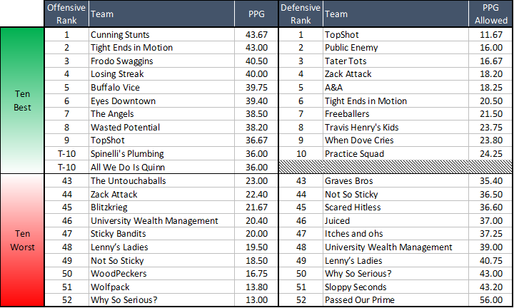 There are only ten teams in the League as of this moment that are winning by an average of 10.0+ PPG, as shown above. Tight Ends is a full 11.3 PPG better than the next closest team. We don't expect this will last: their next two opponents are Eyes Downtown and Public Enemy, who are ALSO on the chart above. But hey, worth appreciating while it lasts. Bro's 52 point effort combined with Bobby's loss to Public Enemy (and his near loss to the same team that Bro dominated this week) is enough to push Bro Kleckler into the #2 ranking.