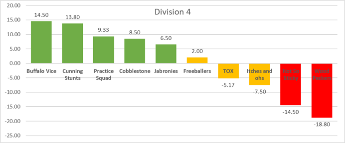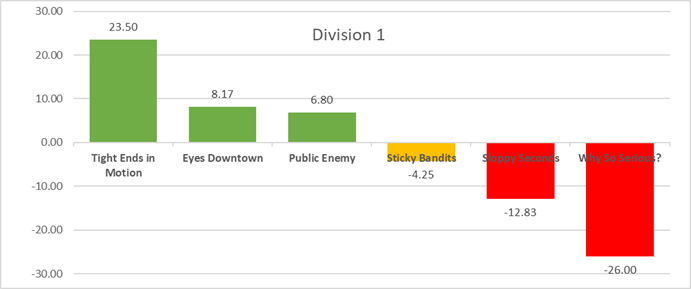 The Sticky Bandits are 4-1 and have an average point differential of +18.6 PPG against teams NOT named Public Enemy or TEIM. They're also 0-4 and have an average point differential of -25.3 PPG against teams that ARE named Public Enemy or TEIM. This was a great debut season in D1 for Sticky Nation, and Mike has surprised many with how well he's adjusted since making the leap from D2. They're going to need some tricks up their sleeves if they want to compete with the top dogs in the playoffs though.