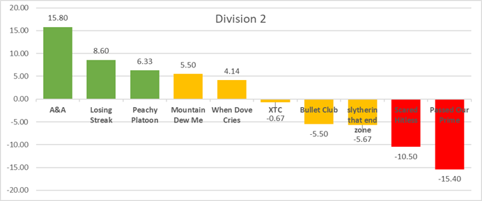 QB Power Ranking Committee's Take: Mountain Dew Me is a one loss team - we imagined they would be in the "favorites" class, but the chart suggests they might not be top tier. We don't believe it. Otherwise this looks about right to us. Worth noting, if you strip out Losing Streak's 55 point win against short handed Passed Our Prime, they would go from "favorites" to a negative point differential. But strip out ANY team's biggest win and it probably changes which grouping they fall under, so we're fine with leaving them as is.