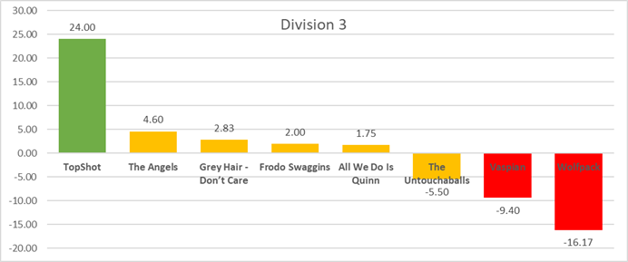 The Top Ten in our Power Rankings seems like a lifetime ago for Vince Taverna, as Quinn drops to 3-3 on the season with a loss to Wolfpack. AWDIQ have scored 2 more points than they've allowed on the season, and they look like the definition of mediocrity at this point. Difficult to imagine them pulling off the upset of TopShot or Frodo Swaggins, but stranger things have happened.