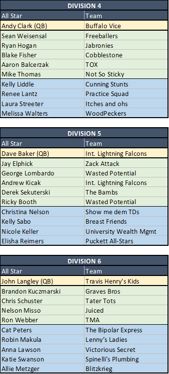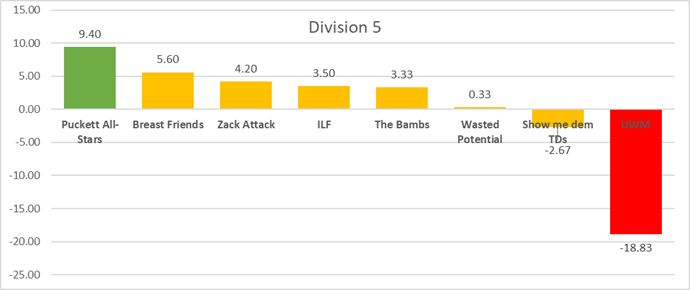 QB Power Ranking Committee's Take: Maybe Topper is right about Puckett All-Stars. The point differentials say they're the only favorite in D5, followed by six contenders (and one Keller team). Not sure we would agree with that. Zack Attack by the way is UNDEFEATED so crazy how they're not the favorites (they keep winning close ones... good for the standings, bad for their math). We would have thought Breast Friends, Zack Attack and ILF would all be "favorites", but maybe not. This is a pretty wide open division too. Unless, of course, you're University Wealth Management.