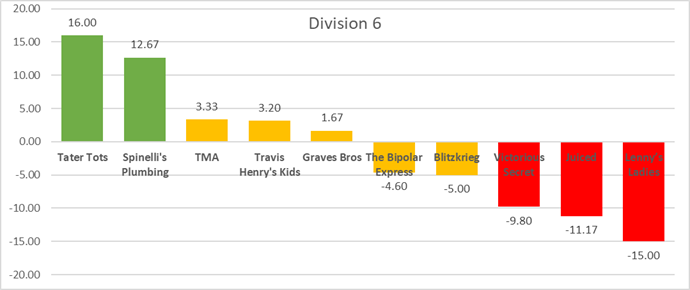 QB Power Ranking Committee's Take: Yes, exactly right. The Tots vs Spinelli's Plumbing SHOULD be your D6 finals. TMA, Travis Henry's Kids, Graves Bros, BiPolar and Blitzkrieg are good enough to ruin that and crash the Finals (TMA in particular has handed the two "favorites" their only two losses on the season!), but the other three teams don't look ready to make a run yet.