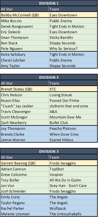Beating the Angels doesn't have the same luster it used to when Matty was under center, but it's still an incredible group of athletes to come out on top against. Grey Hair - Don't Care is 4-4 and in third place in D3 right now, a game behind Frodo Swaggins for second place. Eickhoff's a savvy vet and should be a difficult out in the playoffs... but we're not sure that they (or anyone else in D3) have got the consistency to take out TopShot.