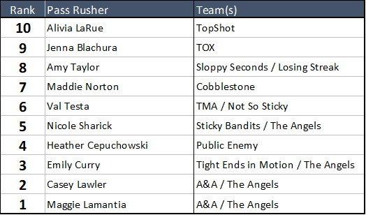 Here are your Top Ten Best Female Pass Rushers this Spring 2021 season, as voted on by our Committee (in the interests of creating suspense, we'll count down from Ten):