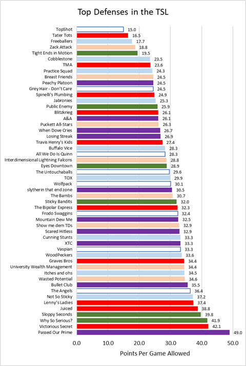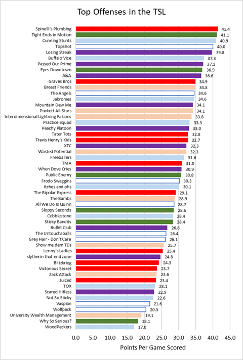 - Stats and Charts - Earlier this season we took a look at the "Best and Worst" of the TSL in terms of offense and defense. Now that the season is almost over, let's check back in on who our most dominant (and least dominant) teams are.