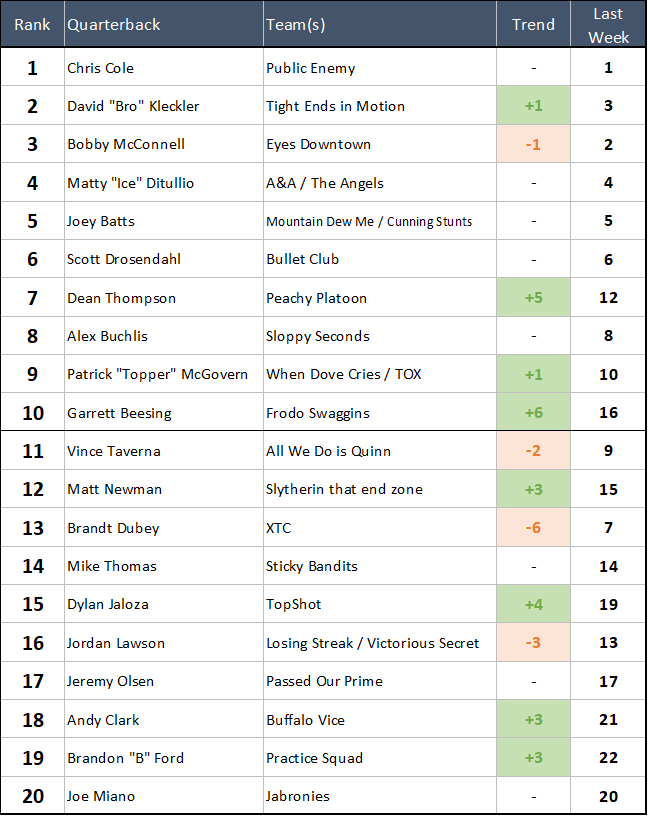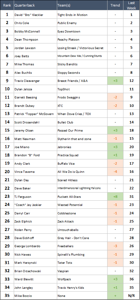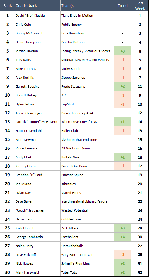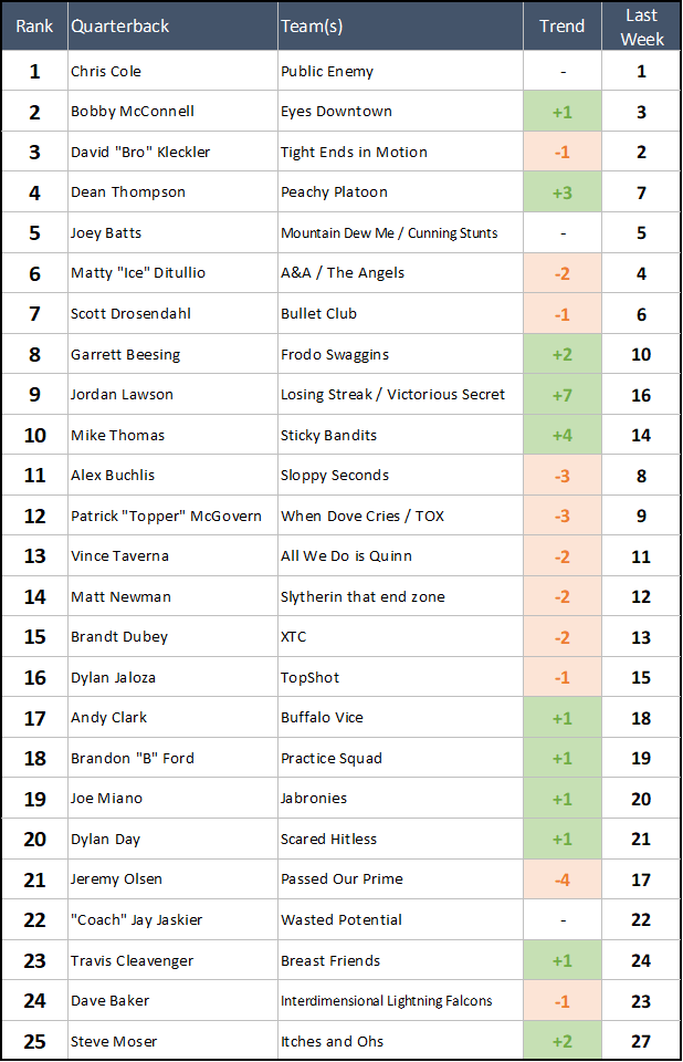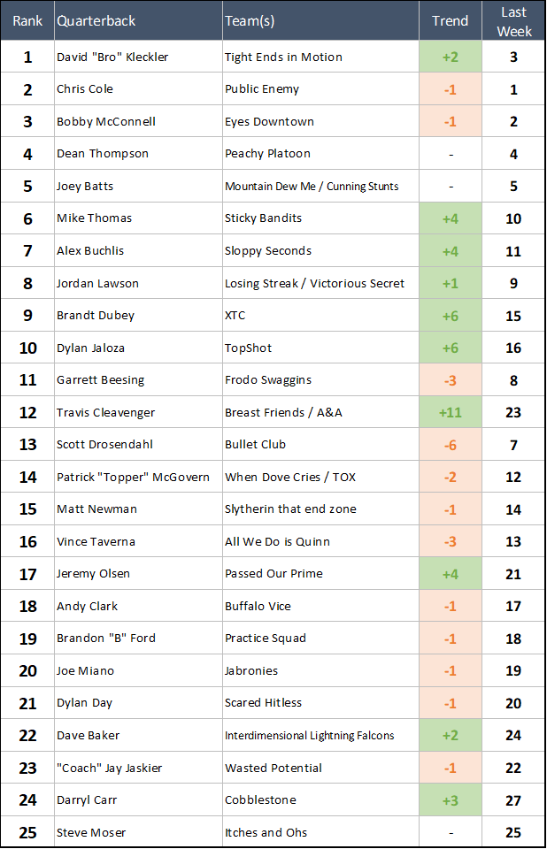 What's more impressive: a 34 point shutout win, or a 1 point shootout win where you needed to score 57 to narrowly pull off the W? Whatever you prefer, Travis had them both this week, so he rises three spots in the Power Rankings. Is A&A planning on giving Matty the job back for playoffs, or is this Travis's team to lead now? We have no idea, but either way Travis will be throwing for at least ONE team that's expected to make a serious playoff push.