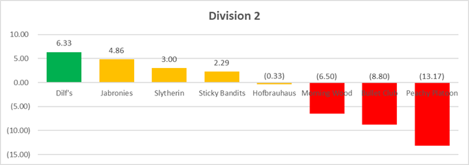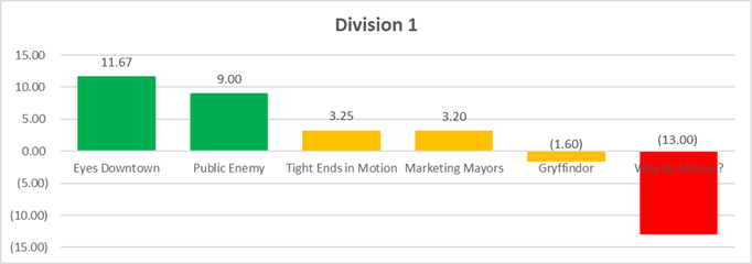 For each division, we've graphed average point differential per game, per team. This includes all games that teams have played, including Crossover weeks with other divisions (which yes, skews the data a bit, since not all teams have played Crossover games yet). Forfeit games are NOT included below.