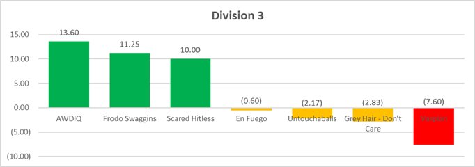 Quinn and Frodo Swaggins are D3 superpowers. No surprises there. Vaspian doesn't look ready to contend this season, but we think of all the other teams as Contenders. The only real outlier in this graph is Scared Hitless, who are averaging +10 PPG... however this would drop to -0.5 PPG if we threw out their 52-0 Crossover game against the D4 Freeballers, which is BADLY skewing their data here. So take that "favorite" with a grain of salt.