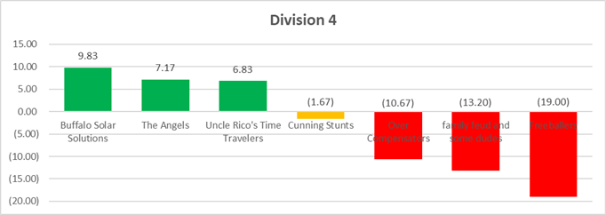 D4 is really spot on, isn't it? Three teams seem to be a notch above the rest, Cunning Stunts is dangerous but flawed with their nonexistent defense, and then the other three teams aren't really expected to compete for the championship. If you're one of those three pretenders, don't blame us, that's the graph talking.