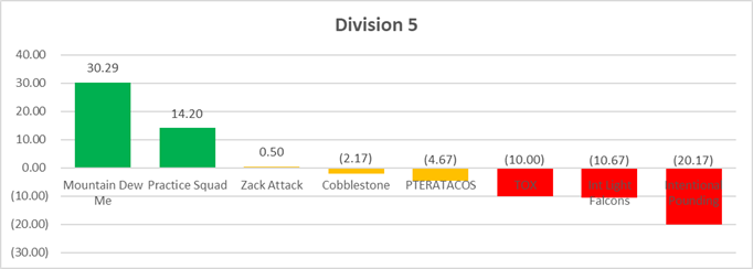 There are two contenders in D5, and one of them is much better than the other. The "eye test" says it's true, and the graph confirms the hell out of it. A few teams have respectable point differentials and you never know, they could make some noise in the playoffs, but it would be a shock if our finals was anything other than the Dew vs the Squad.