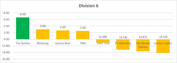 One of the reasons we love graphs so much is they tell us stories we might not have known otherwise. D2 somewhat deservedly has a reputation as the most wide open division this year, but take a look at D6. We did NOT realize there was this much parity. If the Bambs had scored one fewer touchdown in ANY of their games this season (or allowed one more touchdown on defense), we would be looking at 8 teams ALL within 6 PPG one way or the other. There would be no favorites, no pretenders, just a division of 8 contenders. And we think that's pretty awesome. But hey, good for the Bambs for ruining this graph by being SLIGHTLY better than their peers.