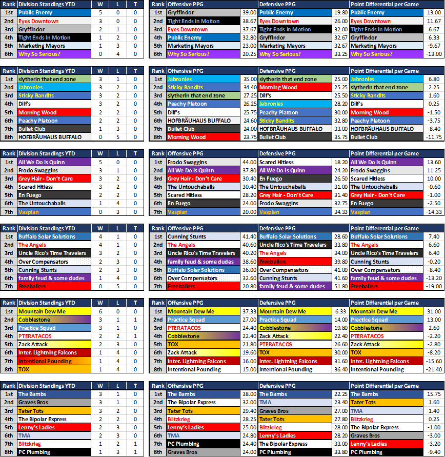 Teams highlighted in GREEN are your division favorites, YELLOW are your contenders, and RED are your pretenders. We did NOT make any subjective decisions as to which team belongs in which category, so don't send us any angry emails - this is strictly math. If your team is one of the dozen in this league that are winning by an average of more than 6 points per game (one male TD), congrats, you're a favorite in your division. If your team is one of 11 in this league that are losing by an average of more than 6 points per game, sorry, you're a pretender in your division. The other 21 teams that are either winning or losing games by less than 6 points on average fall into the contender bucket.