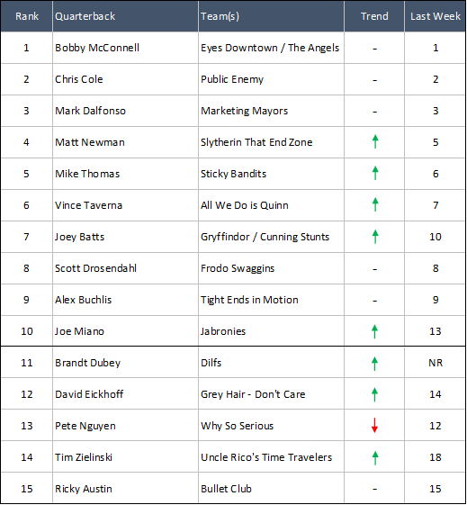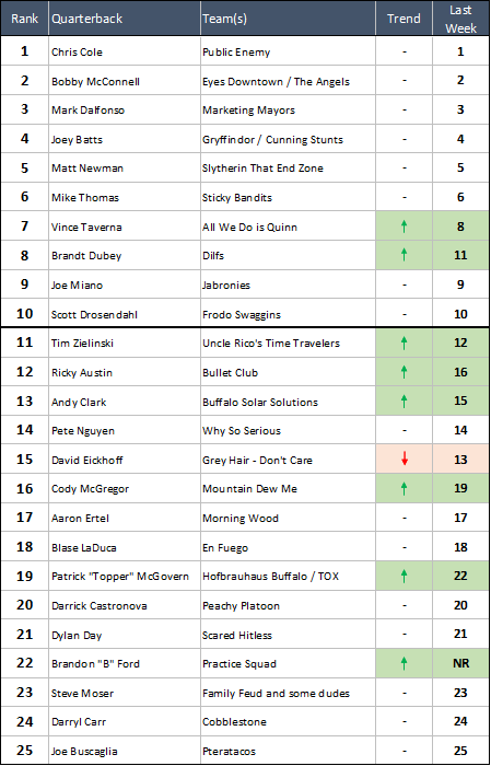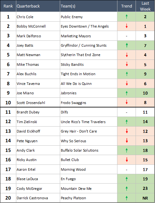 #11 Brandt Dubey - FINALLY we get to rank a Dilfs QB. They've always been good, they just seem to shuffle around too much for us to commit to one in our rankings. Dubey went 1-1 this week, dropping the Jabronies game 36-20 and then beating Bullet Club 27-15. Dubey is one of only five QBs in the history of our Power Rankings to ever crack the Top Two.