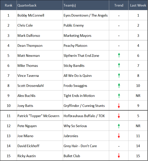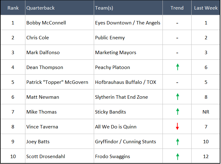 So if not Topper, then who gets the #4 spot? We really agonized over this, as there's no obvious answer here. You can argue the merits of any of the other contenders, but we felt like Dean Thompson (#4) deserved it the most. Peachy Platoon actually LOST this week on a walk off TD to Bullet Club, but Dean has been consistently great since moving up to the higher divisions, and outside of the "Big Three" he's the QB we would most want to lead our team right now. Congrats on failing your way to your highest ranking yet Dean!