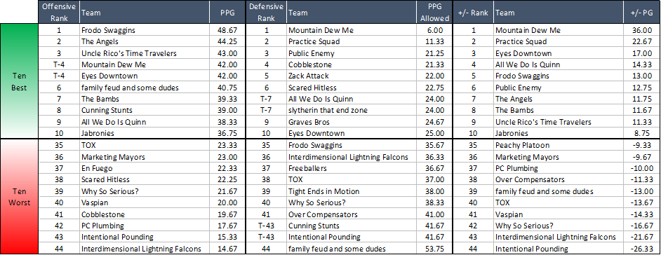 Here are the ten best and ten worst teams in the League across ALL divisions for Offense, Defense, and overall Point Differential (+/-). We'll do a divisional breakdown some other week.