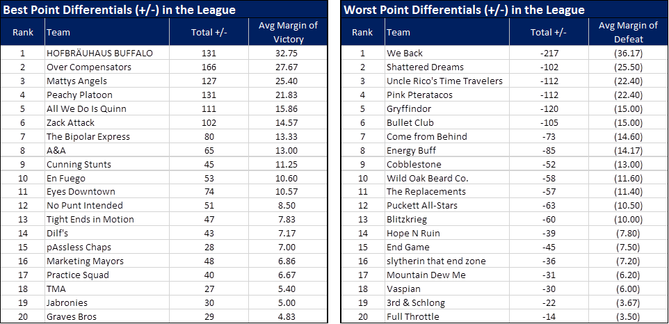In the past two weeks we’ve shared some charts with the top offenses and top defenses in the League – this week we’re going to take a look at average point differentials (+/-) to see who are the most dominant (and most dominated) teams in the League: