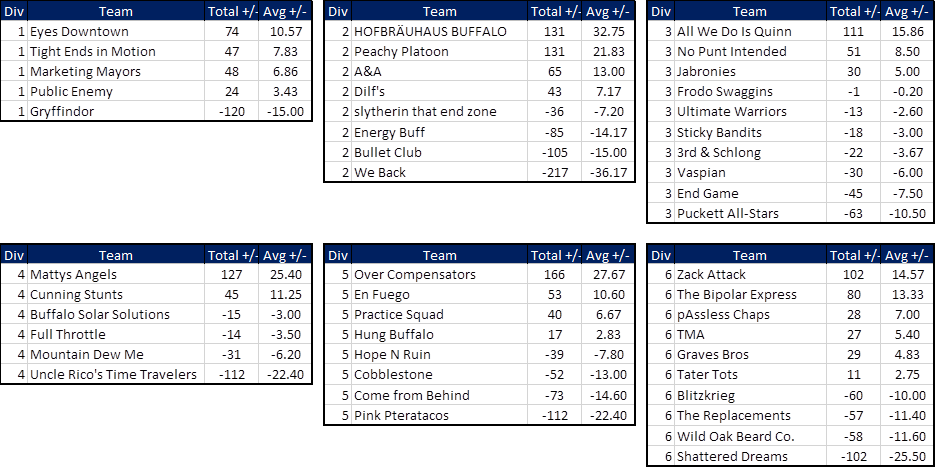 Overrated: No one’s REALLY underrated or overrated here, as this is the ONLY division in TSL this session where the point differentials rankings EXACTLY match the standings (look at the chart above) which suggests that teams finished exactly where they should have in the standings. But if we were forced to choose one “overrated” team we’d say maybe Hung Buffalo. Their #3 seed implies they have a chance to win this division, and we don’t see it happening. They’re 5-4 but they lost to Over Compensators by 17 points and En Fuego by 20. These are the teams you have to beat if you want a shot at the D5 title this season, and Hung Buffalo hasn’t shown that they can hang with either of these teams despite their winning record.