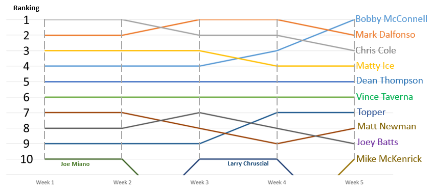 · Tier 2 - Dean and Vince, who have literally not moved once all season and sit at 5 and 6 respectively (Dean’s probably wondering why he doesn’t get to be in a Tier of his own over Vince, but screw it, we’re lumping you guys in together here)