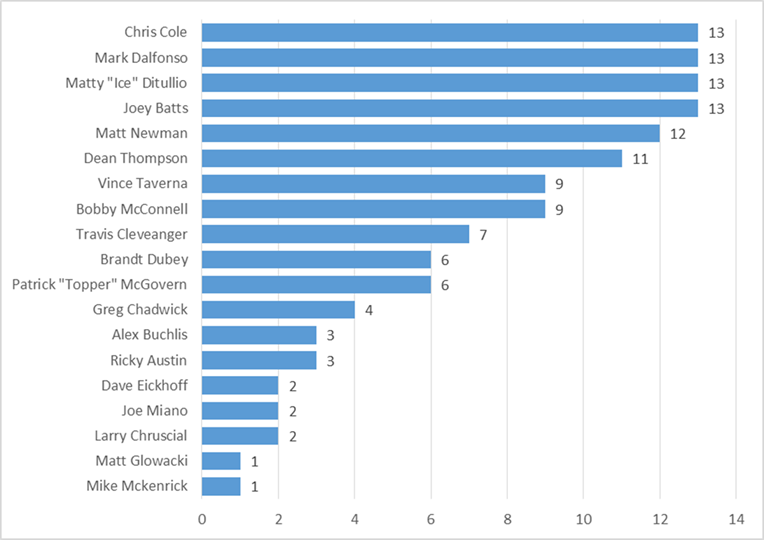 We REALLY wanted to make a line graph going back to Week One of LAST season, but that got ugly pretty fast so we abandoned it. Instead, here’s a simple chart of how many times each quarterback in our League has ranked in the Top Ten through the past thirteen weeks (all of Spring Session and all of Fall Session through five weeks):