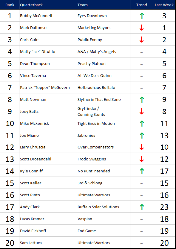 Welcome back to another “critically acclaimed” edition of your TSL Quarterback Power Rankings! Your headline for this week: there’s a new king of the mountain. Chris Cole held our top spot for ten weeks, including all of last season and the first two weeks of Fall 2019. Mark Dalfonso, defending D1 champion, then took over the top spot for two weeks. And now we have our third #1 Quarterback in the season-and-a-half history of the TSL QB Power Rankings: Bobby McConnell. Long may he reign.